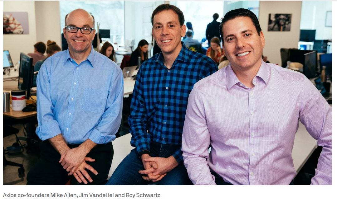 악시오스는 지난 2017년 전 폴리티코(Politico) 임원인 짐 반데헤이와 마이크 알렌(Mike Allen), 로이 스와츠(Roy Schwartz)에 의해 설립됐습니다.
